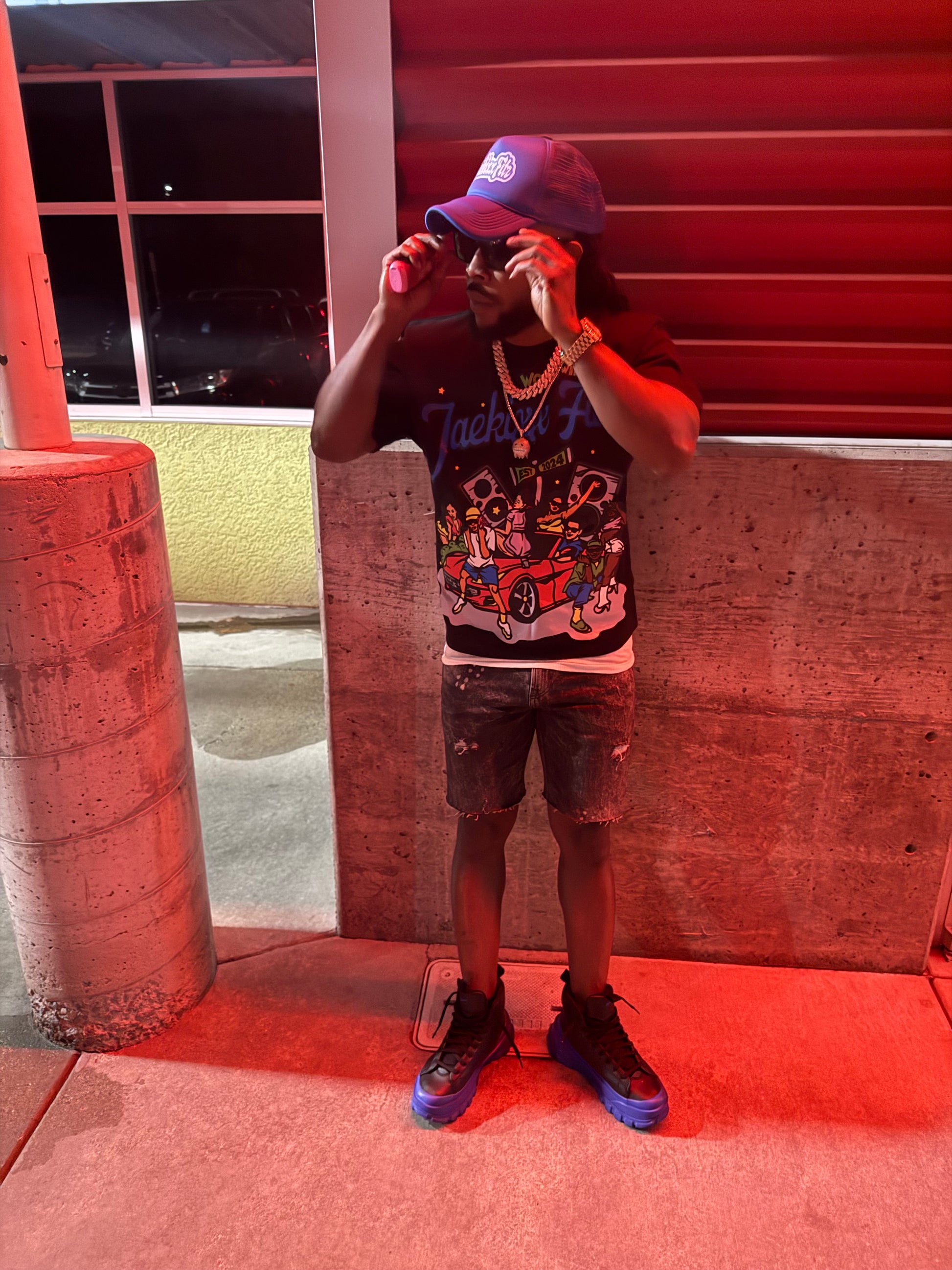 • Bold Graphic Print – Eye-catching cartoon characters cruising in style with “Jaekixx Fitz” front and center